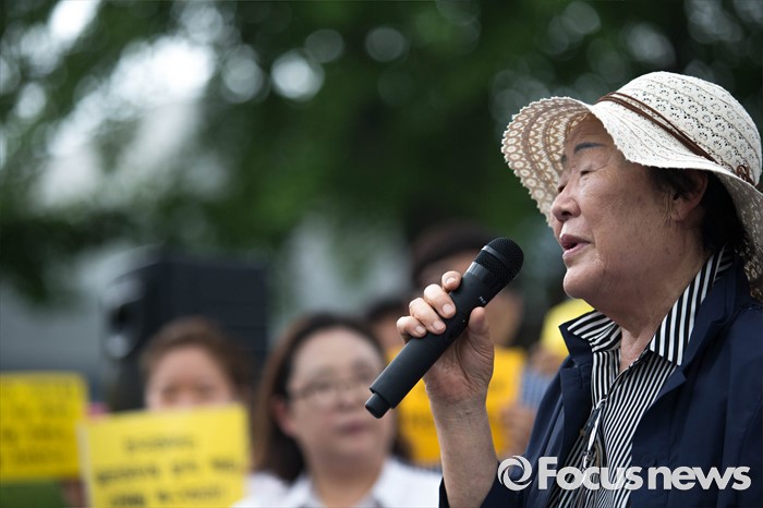 (서울=포커스뉴스) 25일 오전 서울 종로구 정부서울청사 앞에서 화해·치유재단 설립 강행하는 정부를 규탄하는 정대협(한국정신대문제대책협의회) 및 일본군 위안부 피해자 할머니들의 집회가 열리고 있다.