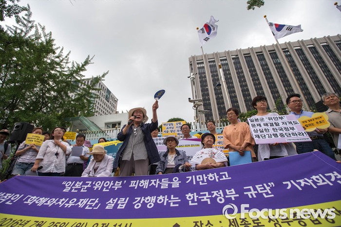(서울=포커스뉴스) 25일 오전 서울 종로구 정부서울청사 앞에서 화해·치유재단 설립 강행하는 정부를 규탄하는 정대협(한국정신대문제대책협의회) 및 일본군 위안부 피해자 할머니들의 집회가 열리고 있다.