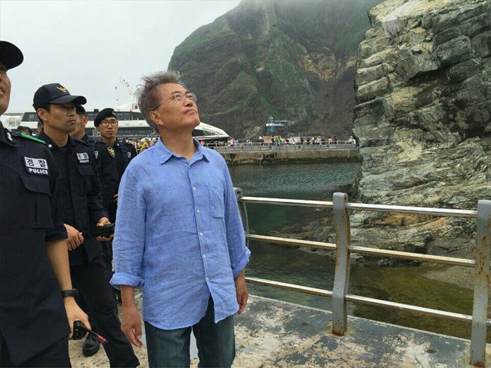 (서울=포커스뉴스) 문재인 더불어민주당 전 대표가 광복절을 앞두고 25일 독도를 방문, 송지원 경비대장에게 설명을 들으며 둘러보고 있다. <사진제공=문재인 전 대표측>