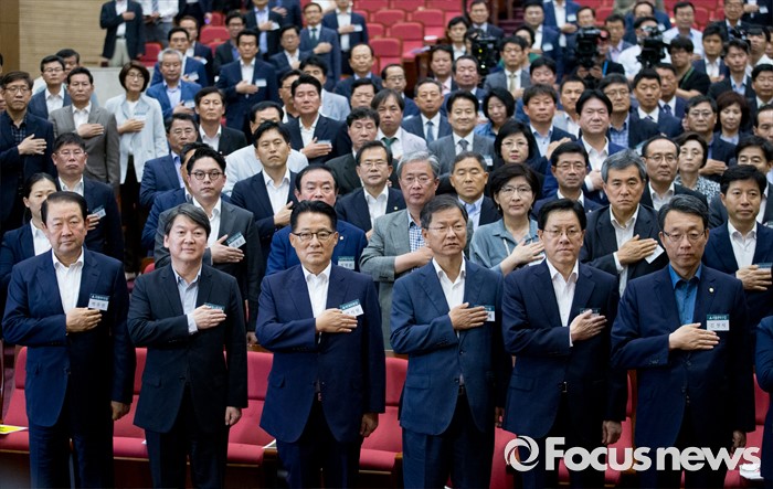 (서울=포커스뉴스) 25일 오후 서울 여의도 국회 의원회관에서 열린 국민의당 지역위원장 임명장 수여식 및 연석회의에 참석한 박주선(앞줄 왼쪽부터) 국회 부의장, 안철수 전 상임공동대표, 박지원 비상대책위원장, 천정배 전 공동대표, 주승용 비대위원, 김성식 정책위의장 등이 국기에 대한 경례를 하고 있다.