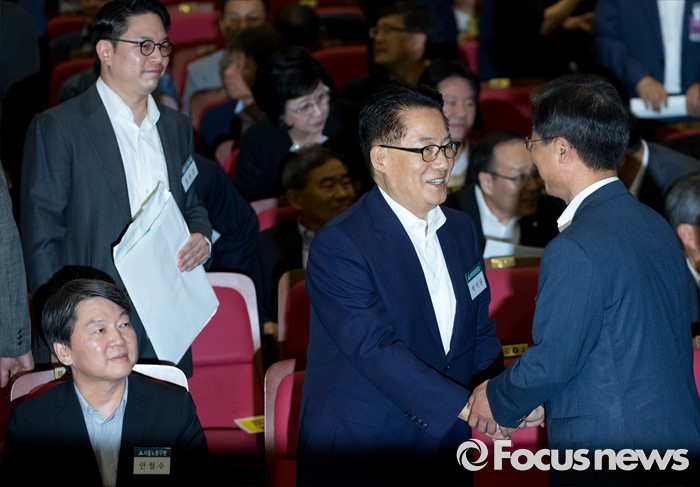 (서울=포커스뉴스) 25일 오후 서울 여의도 국회 의원회관에서 열린 국민의당 지역위원장 임명장 수여식 및 연석회의에 참석한 박지원(가운데) 비상대책위원장과 천정배(오른쪽) 전 공동대표가 인사하고 있다. 왼쪽은 안철수 전 상임공동대표.