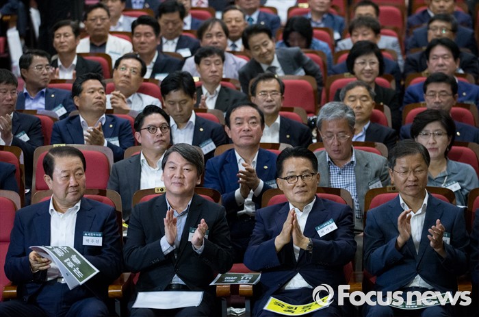 (서울=포커스뉴스) 25일 오후 서울 여의도 국회 의원회관에서 열린 국민의당 지역위원장 임명장 수여식 및 연석회의에 참석한 박주선(앞줄 왼쪽부터) 국회 부의장, 안철수 전 상임공동대표, 박지원 비상대책위원장, 천정배 전 공동대표 등이 박수치고 있다.