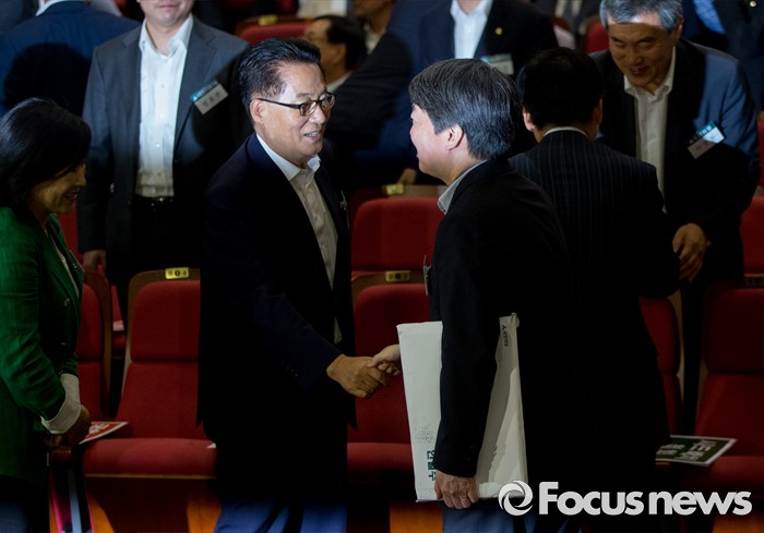 (서울=포커스뉴스) 25일 오후 서울 여의도 국회 의원회관에서 열린 국민의당 지역위원장 임명장 수여식 및 연석회의에 참석한 박지원(왼쪽) 비상대책위원장과 안철수 전 상임공동대표가 인사하고 있다.