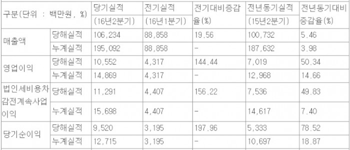 또 2분기 순이익은 95억2000만원으로 전년 동기 대비 78.6% 늘어났다. 매출액은 전년 동기 대비5.5% 증가한 1062억3400만원을 기록했다.