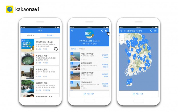 이번 이벤트에 포함되는 피서지 80곳은 카카오내비 첫화면의 '태그' > '추천태그'의'#이벤트대상피서지'에서 모두 확인할 수 있다. 장소는 인기순 및 가까운순으로 정렬해 확인할 수 있으며 지도뷰를 사용하면 80개 장소를 지도 화면으로 한 눈에 확인할 수 있다. 장소는 한 곳씩 눌러 길안내를 받거나 '태그 저장'을 눌러 추천태그 목록에 있는 80개 장소를 자신의 벌집에 한번에 저장한 후 한 곳 씩 길안내를 받거나 편집할 수 있다.