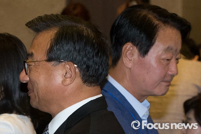 (서울=포커스뉴스) 전당대회 대표최고위원 출마를 선언한 이정현(왼쪽), 한선교 새누리당 의원이 25일 오후 서울 여의도 중소기업중앙회관에서 열린 중앙위원회 전국시도당연합회 월례회 행사에 참석해 각각 다른 곳으로 이동하고 있다.