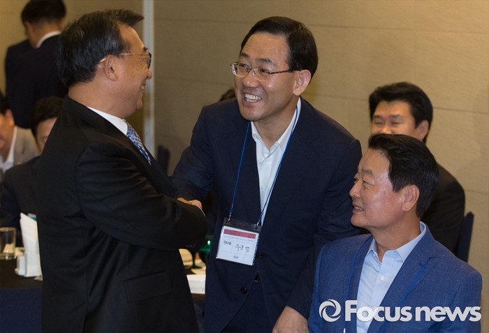 (서울=포커스뉴스) 전당대회 대표최고위원 출마를 선언한 이정현(왼쪽부터), 주호영, 한선교 새누리당 의원이 25일 오후 서울 여의도 중소기업중앙회관에서 열린 중앙위원회 전국시도당연합회 월례회 행사에 참석해 인사하고 있다.