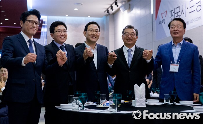 (서울=포커스뉴스) 전당대회 대표최고위원 출마를 선언한 정병국(왼쪽부터), 김용태, 주호영, 이정현, 한선교 새누리당 의원이 25일 오후 서울 여의도 중소기업중앙회관에서 열린 중앙위원회 전국시도당연합회 월례회 행사에 참석해 취재진을 향해 포즈를 취하고 있다.