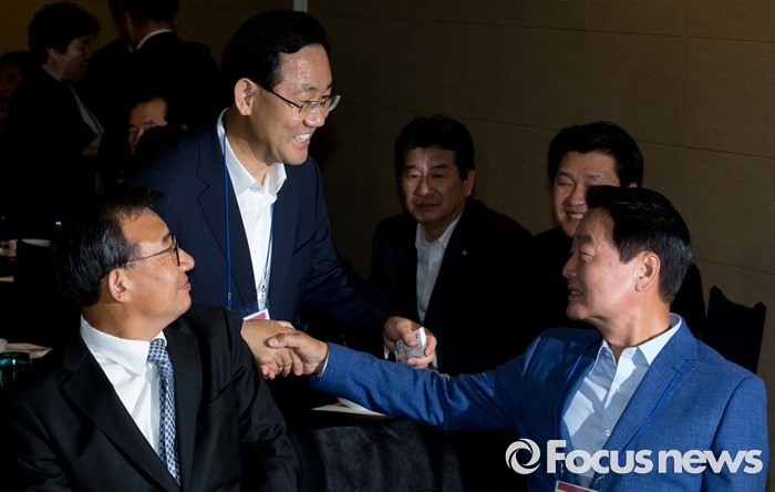 (서울=포커스뉴스) 전당대회 대표최고위원 출마를 선언한 이정현(왼쪽부터), 주호영, 한선교 새누리당 의원이 25일 오후 서울 여의도 중소기업중앙회관에서 열린 중앙위원회 전국시도당연합회 월례회 행사에 참석해 인사하고 있다.