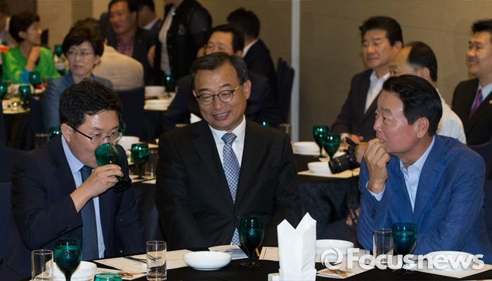 (서울=포커스뉴스) 전당대회 대표최고위원 출마를 선언한 김용태(왼쪽부터), 이정현, 한선교 새누리당 의원이 25일 오후 서울 여의도 중소기업중앙회관에서 열린 중앙위원회 전국시도당연합회 월례회 행사에 참석해 대화하고 있다.