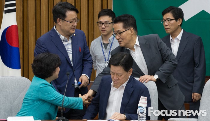 (서울=포커스뉴스) 26일 오전 서울 여의도 국회에서 열린 국민의당 의원총회에 참석한 박지원 비상대책위원장이 의원들과 인사하고 있다.