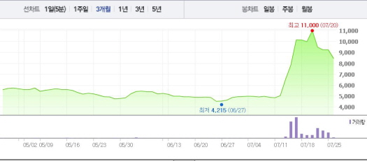 이후 25일 보합세를 나타냈지만 이날 다시 8%대 하락폭을 기록하며 내림세로 접어들었다.