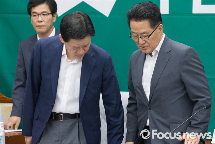 (서울=포커스뉴스) 26일 오전 서울 여의도 국회에서 열린 국민의당 의원총회에 참석한 박지원(오른쪽) 비상대책위원장과 주승용 비대위원이 대화하고 있다.