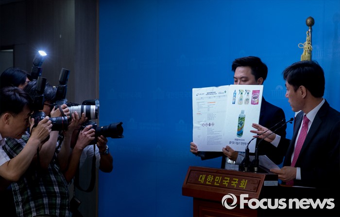 (서울=포커스뉴스) 26일 오전 서울 여의도 국회 정론관에서 하태경 가습기 살균제 특위 새누리당 간사가 홈키파 등 생활화학제품을 제조하는 헨켈홈케어코리아에서 만든 가습기 살균제 제품 '홈키파 가습기싹'과 관련 기자회견을 하고 있다.