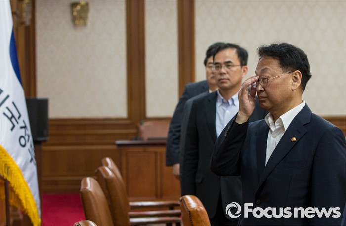 (서울=포커스뉴스) 26일 오전 정부서울청사에서 열린 국무회의에 참석한 유일호(맨 오른쪽) 경제부총리 겸 기획재정부 장관을 비롯한 국무위원들이 국민의례를 기다리고 있다.