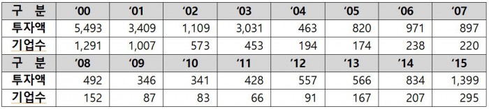 2000년 5493억원 규모였던 엔젤투자는 2004년 벤처버블이 꺼지면서 463억원으로 급감했으며, 2011년에는 428억원으로 최저치를 기록했다. 이후2012년 557억원, 2013년 566억원, 2014년 834으로 조금씩 살아나고 있는 추세다.