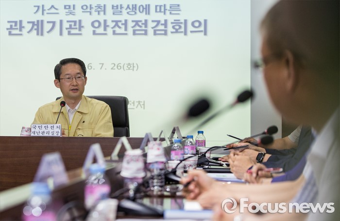 (서울=포커스뉴스) 26일 오전 정부서울청사에서 열린 가스 및 악취 발생 관계기관 안전점검회의에 참석한 김희겸 국민안전처 재난관리실장이 모두발언을 하고 있다.