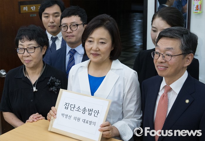 (서울=포커스뉴스) 박영선 더불어민주당 의원과 관계자들이 26일 오전 서울 여의도 국회 의안과에서 집단소송법 제정 법안을 제출하고 있다. 박 의원은 앞서 기자회견을 통해 "미국에만 거액 배상을 합의한 폭스바겐측의 행태는 현행 민사소송법 한계를 드러낸 것으로 우리 국민들의 적절한 피해배상과 신속한 권리구제를 위해 징벌적 배상제 도입과 함께 집단소송제 도입이 시급해 대표발의했다"고 전했다.