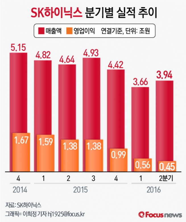 SK하이닉스 측은 세계 경제의 불확실성과 급변하는 시장환경 속에서도 지속적인 기술력 강화로 사업 경쟁력을 키워갈 것이라고 강조했다.(서울=포커스뉴스) 26일 SK하이닉스가 올해 2분기에 3조9409억원의 매출을 올렸다고 공시했다.이는 지난해 2분기 매출(4조6386억)보다 15% 감소한 실적이다. 영업이익은 4529억원으로 전년동기대비 67% 감소했다. 2016.07.26 이희정 기자