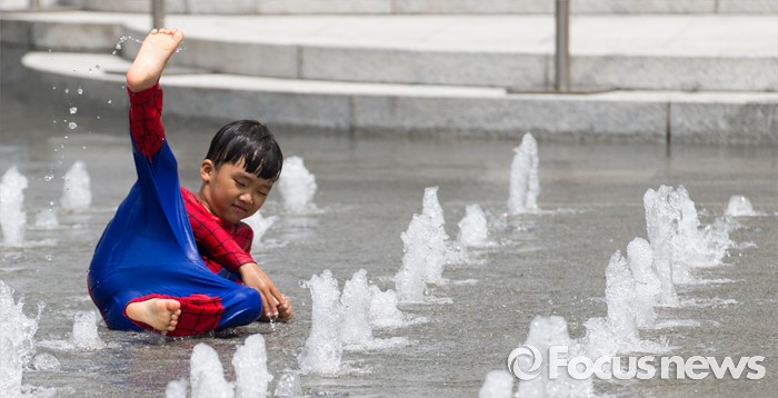 (서울=포커스뉴스) 무더위가 지속되고 있는 26일 오전 광화문광장 분수대에서 한 아이가 물놀이를 즐기고 있다.
