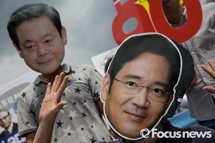 (서울=포커스뉴스) 26일 오전 서울 종로구 광화문광장에서 열린 삼성 경영권 세습 공개토론 제안 기자회견에 참석자들이 삼성의 경영세습을 비판하는 퍼포먼스를 하고 있다.