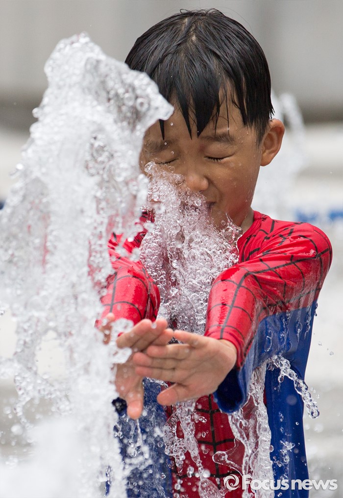 (서울=포커스뉴스) 무더위가 지속되고 있는 26일 오전 광화문광장 분수대에서 한 아이가 물놀이를 즐기고 있다.