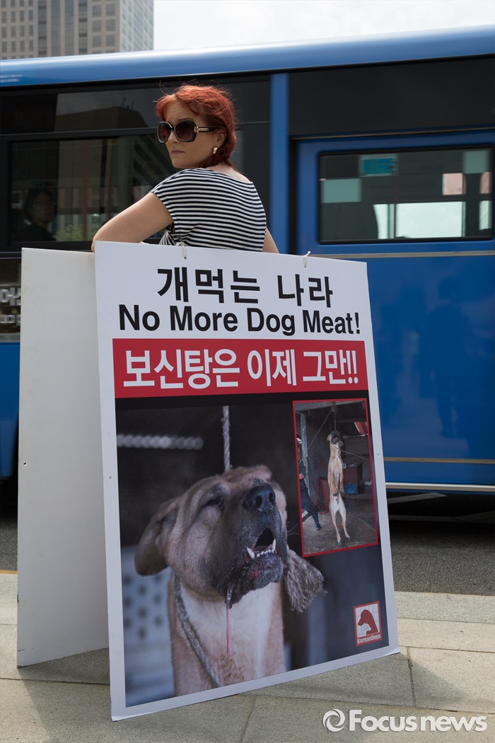 (서울=포커스뉴스) 26일 오전 서울 종로구 광화문광장에서 세이브 코리언 독스 회원이 개고기 문화를 반대하는 피켓을 들고 있다.