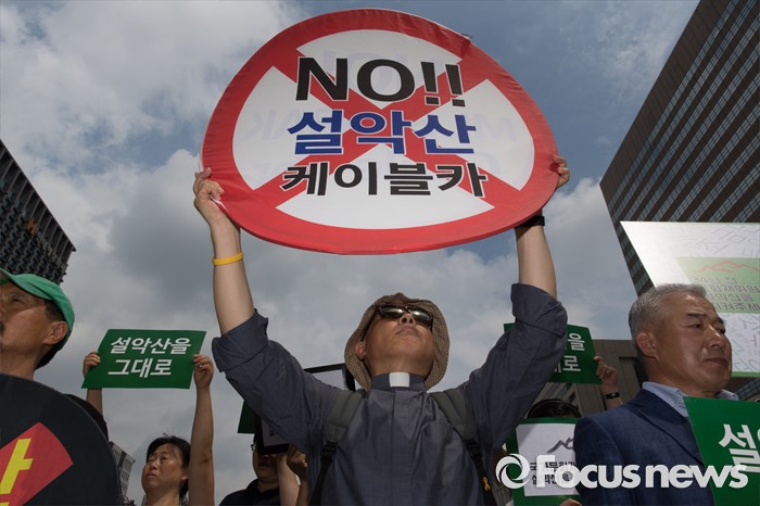 (서울=포커스뉴스) 26일 오전 서울 광화문광장에서 열린 설악산 케이블카 반대 기자회견에 참석한 설악산국립공원지키기 국민행동 회원들이 케이블카 취소 촉구 피켓을 들고 있다.