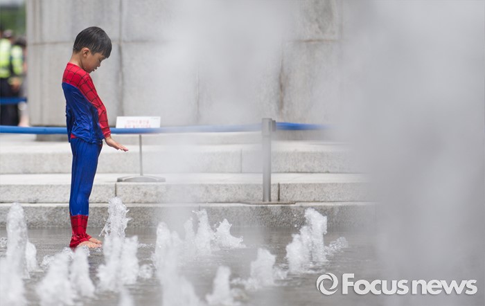 (서울=포커스뉴스) 무더위가 지속되고 있는 26일 오전 광화문광장 분수대에서 한 아이가 물놀이를 즐기고 있다.