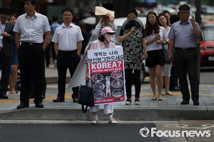 (서울=포커스뉴스) 26일 오전 서울 종로구 광화문광장에서 세이브 코리언 독스 회원이 개고기 문화를 반대하는 피켓을 들고 있다.