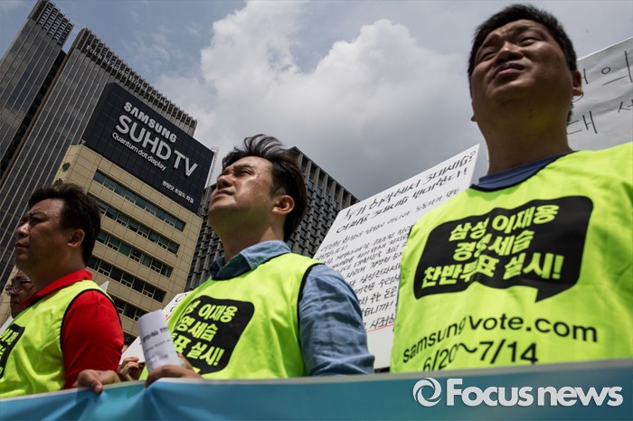 (서울=포커스뉴스) 26일 오전 서울 종로구 광화문광장에서 열린 삼성 경영권 세습 공개토론 제안 기자회견에 참석자들이 삼성의 경영세습을 규탄하고 있다.