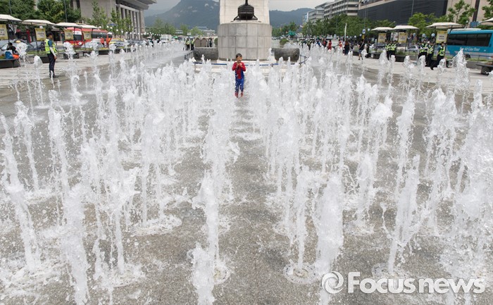 (서울=포커스뉴스) 무더위가 지속되고 있는 26일 오전 광화문광장 분수대에서 한 아이가 물놀이를 즐기고 있다.