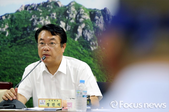 (성주=포커스뉴스) 26일 오전 경북 성주군청을 찾은 정신석 새누리당 원내대표가 성주군민들과 간담회에서 질문에 답변하고 있다.