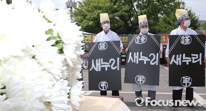 (성주=포커스뉴스) 26일 오전 경북 성주군청을 찾은 정신석 새누리당 원내대표와 지도부들이 성주군민들과 간담회를 가진 가운데 성주주민들이 사드배치 반대를 촉구하고 있다.