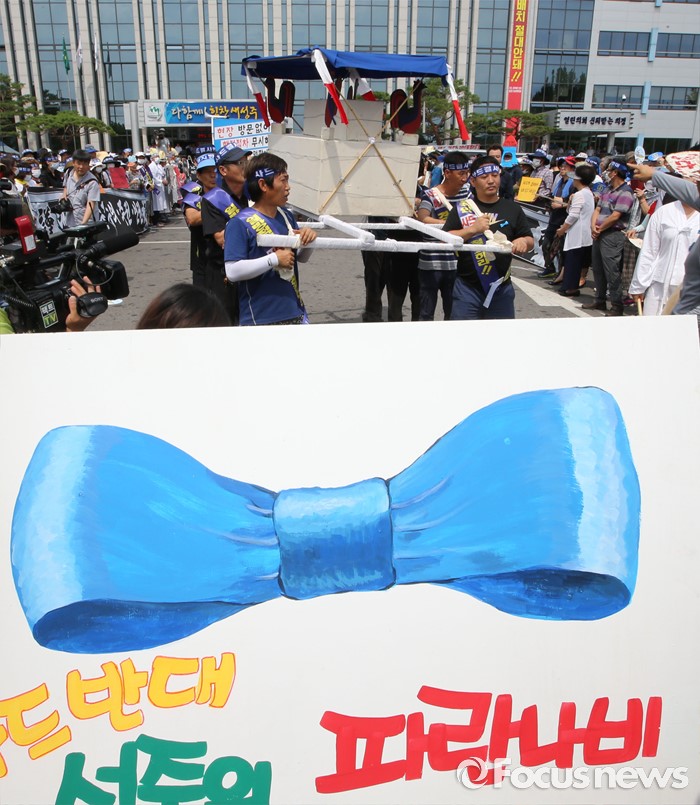 (성주=포커스뉴스) 26일 오전 경북 성주군청을 찾은 정신석 새누리당 원내대표와 지도부들이 성주군민들과 간담회를 가진 가운데 성주주민들이 상여를 매고 사드배치 반대를 촉구하고 있다.