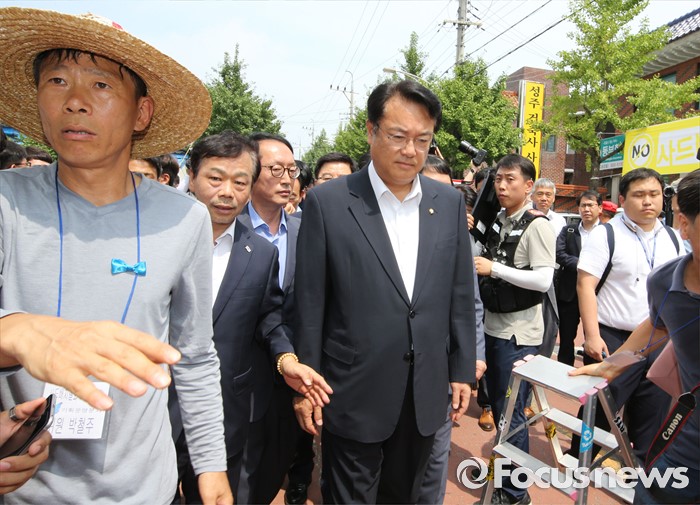 (성주=포커스뉴스) 26일 오전 경북 성주군청을 찾은 정신석 새누리당 원내대표와 지도부들이 성주군민들과 간담회를 갖기 위해 군청으로 이동하고 있다.