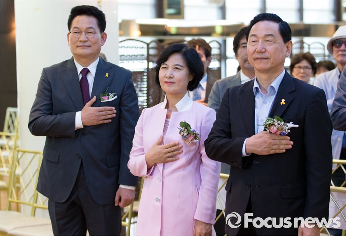 (서울=포커스뉴스) 26일 오후 서울 서초구 엘루체에서 열린 더불어민주당 서울특별시당 서초갑 정기지역대의원대회에서 전당대회 출마를 선언한 송영길(왼쪽부터) 의원과 추미애 의원, 김상곤 의원이 국민의례를 하고 있다.