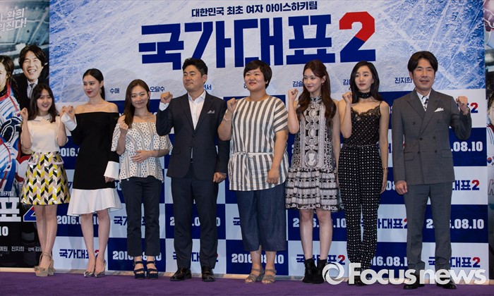 (서울=포커스뉴스) 26일 오후 서울 강남구 메가박스 코엑스점에서 열린 영화 '국가대표2' 언론시사회에 참석한 배우 진지희(왼쪽부터), 김예원, 김슬기, 김종현 감독, 하재숙, 오연서, 수애, 오달수가 포토타임을 갖고 있다.