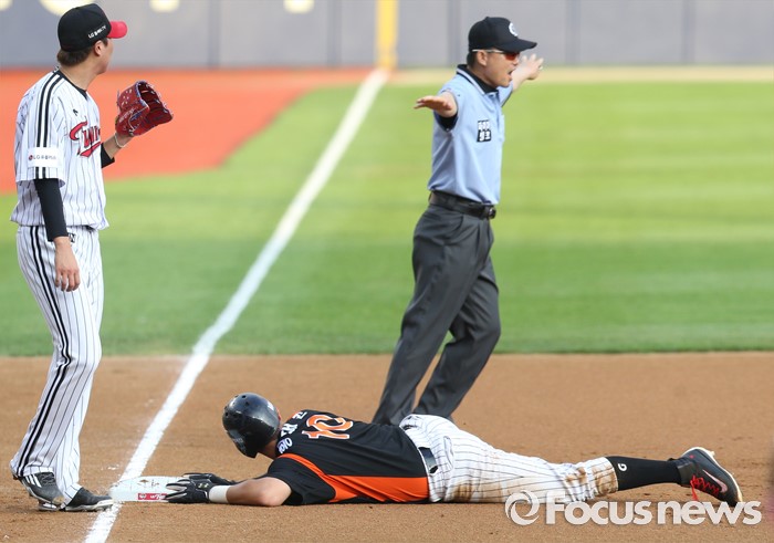 | △ 3루에서 세이프되는 롯데 황재균 |