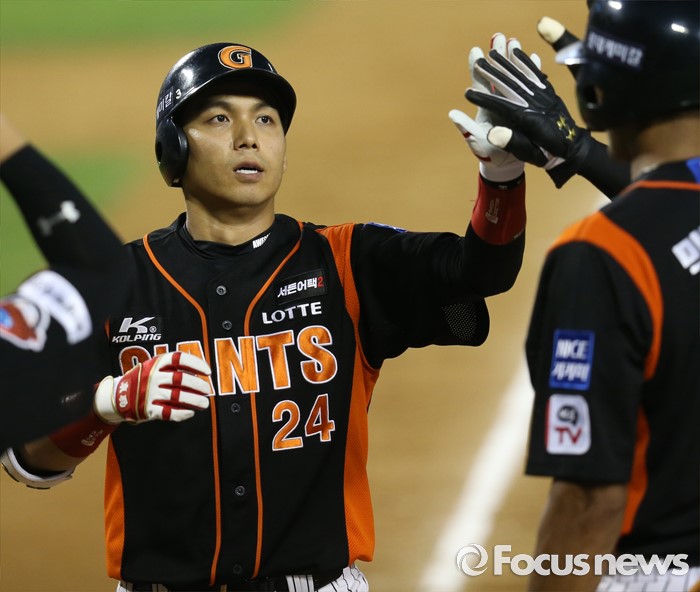 (서울=포커스뉴스) 26일 서울 잠실구장에서 열린 2016 프로야구 롯데-LG 경기 4회초 1사후 롯데 김문호가 우월 만루홈런을 치고 선행 주자들의 환영을 받으며 홈인하고 있다.