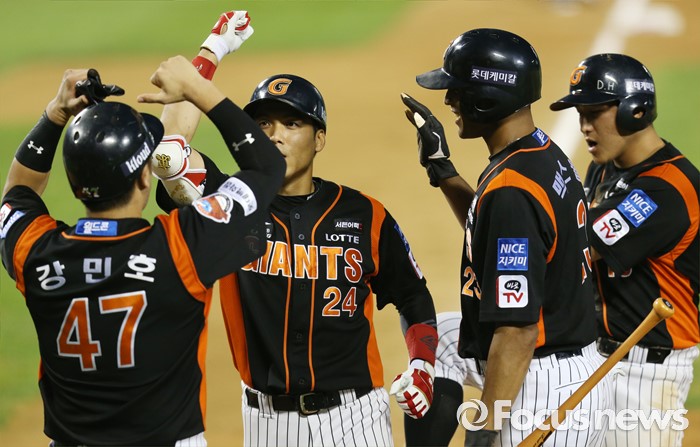 (서울=포커스뉴스) 26일 서울 잠실구장에서 열린 2016 프로야구 롯데-LG 경기 4회초 1사후 롯데 김문호가 우월 만루홈런을 치고 선행 주자들의 환영을 받으며 홈인하고 있다.
