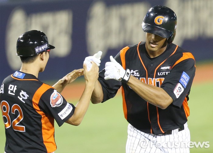 (서울=포커스뉴스) 26일 서울 잠실구장에서 열린 2016 프로야구 롯데-LG 경기 5회초 1사후 롯데 맥스웰이 좌월 솔로 홈런을 치고 3루를 돌며 최만호 코치의 축하를 받고 있다.