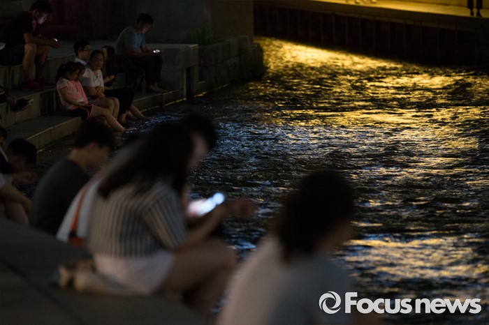(서울=포커스뉴스) 서울과 전국 대분분 지역이 열대야인 26일 오후 서울 종로구 청계천을 찾은 시민들이 더위를 식히고 있다.