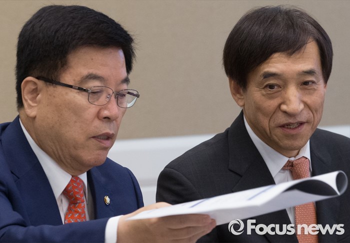 (서울=포커스뉴스) 27일 오전 서울 여의도 국회 귀빈식당에서 열린 경재재정연구포럼 조찬 간담회에 참석한 김광림(왼쪽) 새누리당 정책위의장과 이주열 한국은행 총재가 대화하고 있다.