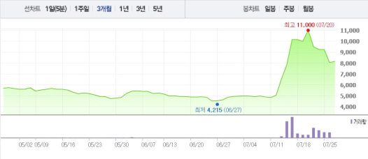 포켓몬 GO는 미국, 캐나다, 호주 등에 시범 출시된 상태며 현재 앱 매출 순위에서 최상위권에 올라갔다. 한국에서도 포켓몬 GO 열풍이 불고 있다. 한빛소프트는 쿠킹 오디션 VR, 헬게이트 VR 등 총 5가지의 VR 콘텐츠를 개발하고 있어 주목을 받았다.주가흐름<사진출처=네이버 캡쳐>