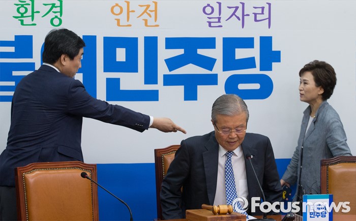 (서울=포커스뉴스) 27일 오전 서울 여의도 국회에서 열린 더불어민주당 비상대책위원회의에 참석한 이종걸(왼쪽), 김현미(오른쪽) 비대위원이 자리 착석 관련 대화하고 있다. 가운데는 김종인 비대위 대표. 이종걸 비대위원은 당대표 경선 출마를 공식화 했다.