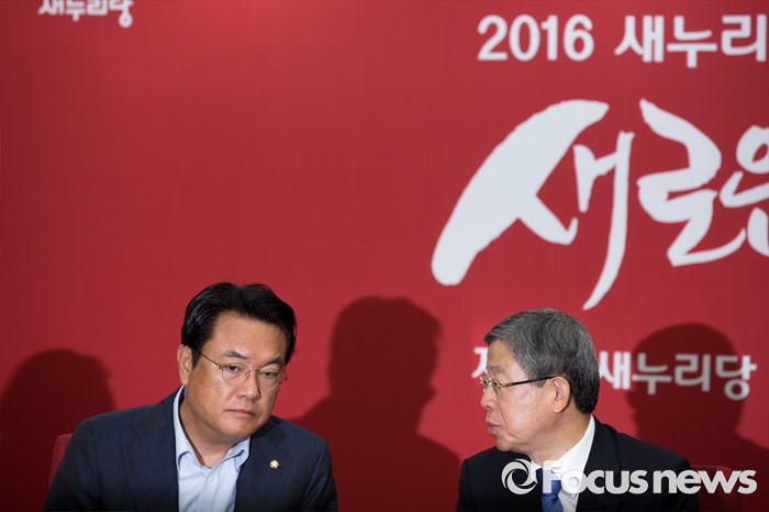 (서울=포커스뉴스) 김희옥(오른쪽) 새누리당 혁신비상대책위원장과 정진석 원내대표가 27일 오전 서울 여의도 새누리당사에서 열린 혁신비상대책위원회의에 참석해 대화 하고 있다.
