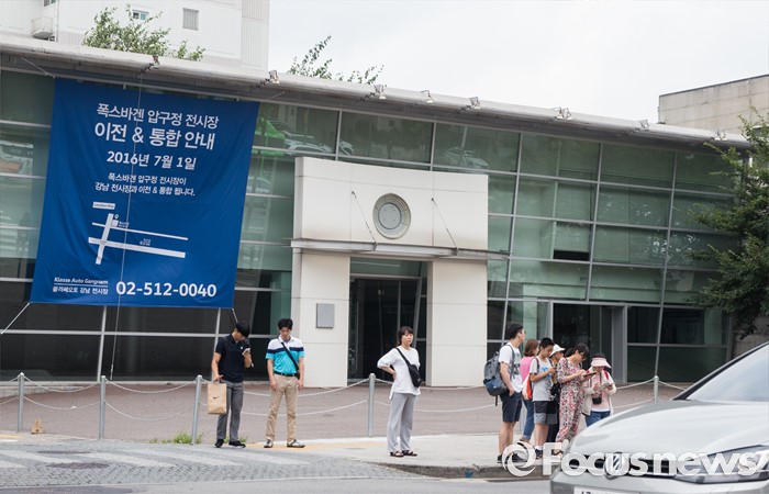(서울=포커스뉴스) 환경부가 내달 초 폭스바겐 차량에 대한 인증취소와 판매금지 등 행정처분을 확정할 계획을 밝힌 가운데, 11년 간 영업을 이어온 폭스바겐 압구정 전시장이 강남 전시장과 이전ㆍ통합을 알리며 간판을 내렸다. 27일 오전 영업을 종료한 폭스바겐 압구정 전시장에 이전을 알리는 현수막이 걸려 있다.