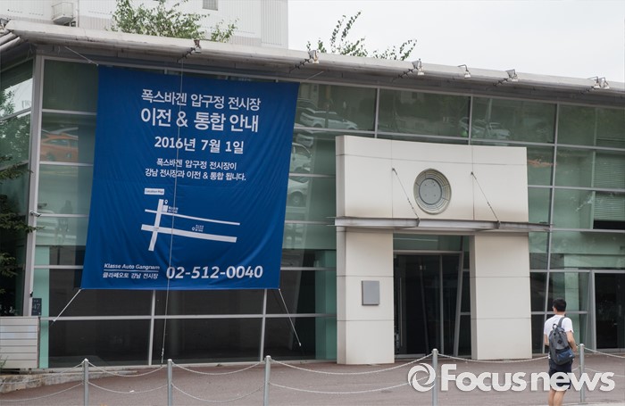 (서울=포커스뉴스) 환경부가 내달 초 폭스바겐 차량에 대한 인증취소와 판매금지 등 행정처분을 확정할 계획을 밝힌 가운데, 11년 간 영업을 이어온 폭스바겐 압구정 전시장이 강남 전시장과 이전ㆍ통합을 알리며 간판을 내렸다. 27일 오전 영업을 종료한 폭스바겐 압구정 전시장에 이전을 알리는 현수막이 걸려 있다.