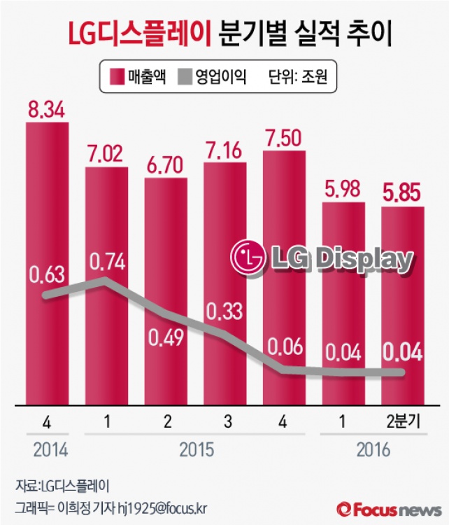 (서울=포커스뉴스) 27일 LG디스플레이는 올해 2분기 실적이 매출액 5조8551억원, 영업이익 444억원을 기록해 17분기 연속 흑자를 이어갔다고 공시했다.